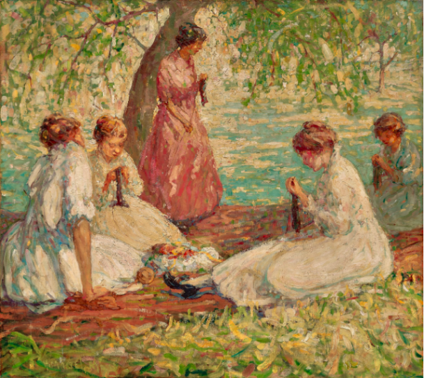 “Dit was een populair thema voor veel Canadese impressionisten”, aldus Atanassova. “Of het nu wordt uitgebeeld in het interieur van een huis, zoals in The Chintz Sofa van Helen McNicoll, of buiten, zoals in H. Mabel May’s Knitting, hun representaties gaven een gevarieerde interpretatie van een leven in harmonie met de natuur.”
