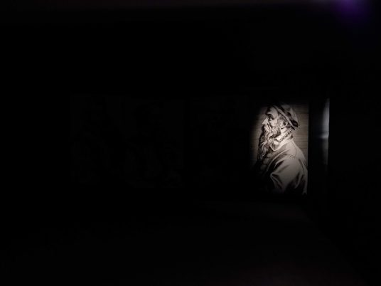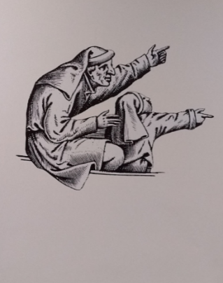 Twee Bruegeliaanse figuren tonen de weg naar de expositie.