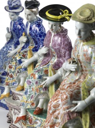 Vier grote kraantjeskannen in de vorm van een dame, Delft, 1760-80, Gemeentemuseum Den Haag – de Lavino Collectie.