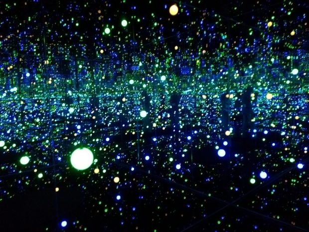 Een enigszins saai ogende witte kubus staat in een van de zalen van Museum Voorlinden in Wassenaar. De deur blijkt echter een portaal naar een heel andere dimensie. Als een ware Alice in Wonderland stapt de bezoeker een fascinerend en steeds van kleur veranderend landschap binnen. Het sprookjesbos, inclusief riviertje, is een creatie van Yayoi Kusama. Het is onderdeel van de kleine tentoonstelling waarmee het museum de negentigste verjaardag van de Japanse kunstenares viert. De expositie zelf duurt tot en met 1 september, maar vanwege groot succes blijft Infinity Mirror Room: Gleaming Lights of the Souls nog de rest van het jaar staan. Zodat zoveel mogelijk mensen deze wonderlijke wereld kunnen betreden.